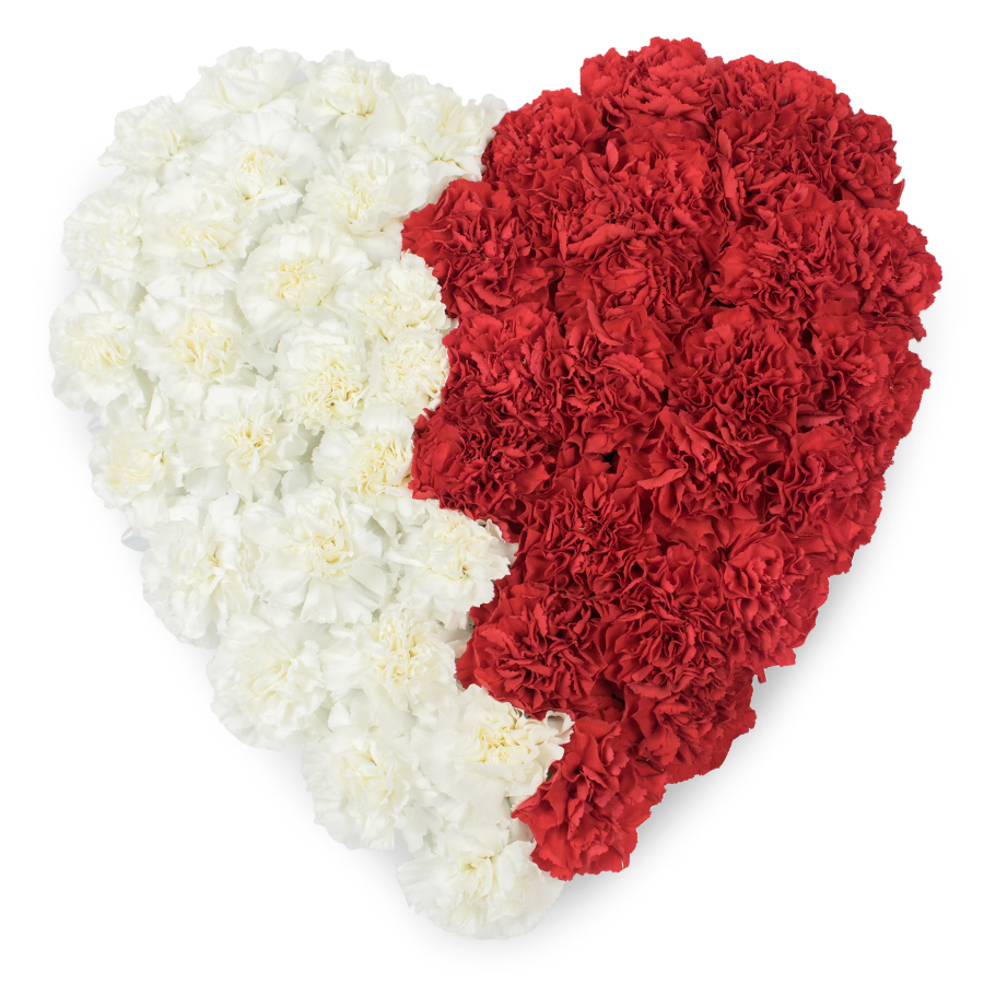 Express your heartfelt emotions with our Lovely Carnations Heart arrangement, beautifully crafted by Handy Flowers. This charming bouquet features a delightful blend of white and red carnations, arranged in a heart shape to symbolize love, sympathy, and appreciation.