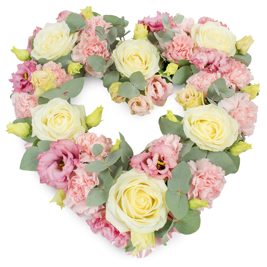 Express your heartfelt sentiments with our Charming Open Heart Tribute Arrangement. This beautiful bouquet features a blend of delicate colors with white roses, pink carnations, pink lisianthus, and fragrant eucalyptus, meticulously arranged to form an open heart.
